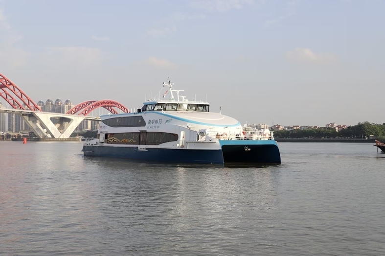 其中,“新明珠3号”作为全国最大载客量碳纤维船(500客位),满载最大航速可达33节。船舶配备锂电池组及太阳能储能电池板,可在船舶停靠码头时保障各项基本用电设施运行,进一步降低日常燃油消耗,实现污染物“零排放”。独特的艏艉对角左右对称设计结合360度可视化辅助靠泊预警系统,使其在8级风浪中也能平稳航行。